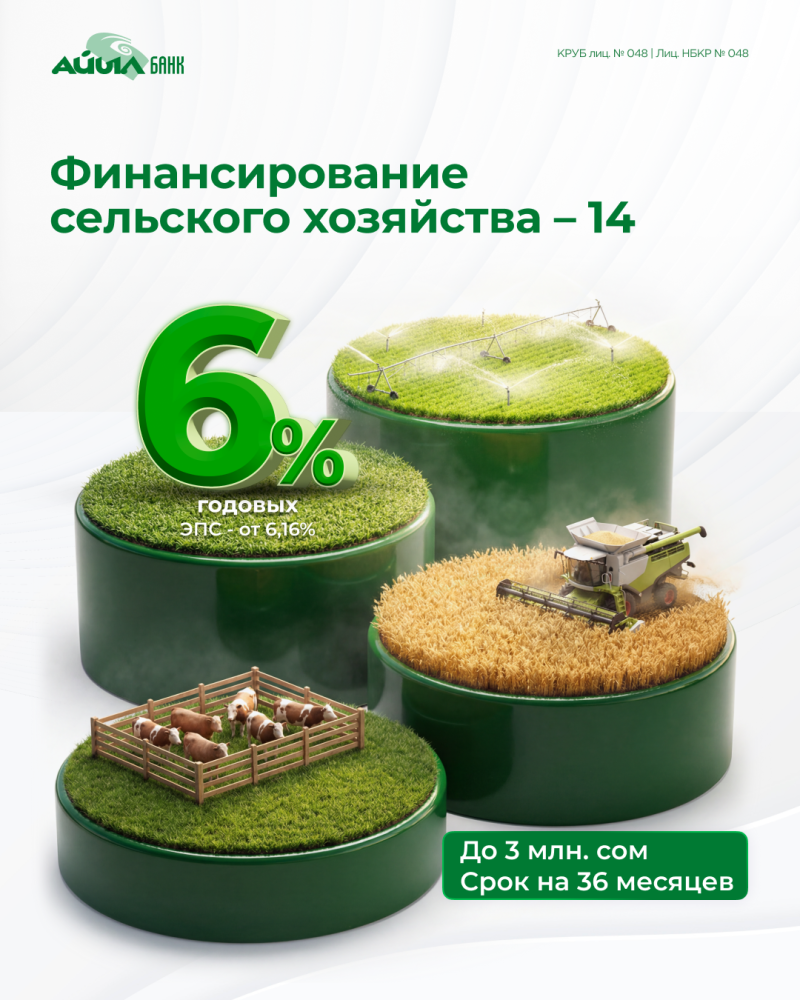 В целях поддержки и развития аграрного сектора Кыргызской Республики «Айыл Банк» начал финансирование фермеров и сельхозпроизводителей в рамках льготной программы «Финансирование сельского хозяйства – 14».