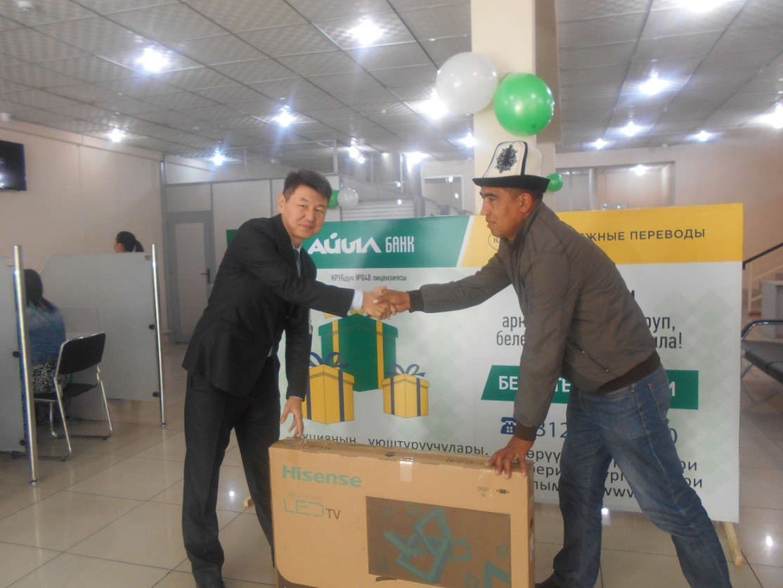 Doors Open Day event in Osh-Datka Branch was attended by the winner of Unistream campaign “Time of gifts” in the South Region – Duishobaev N.M. and was awarded by the gift- TV set. The winner expresses his willingness to continue working with Aiyl Bank and use its services. Branch employees arranged excursion for 2nd year students on Osh State University and teachers of department of Business and Management (Majors: Finance and Credit, Business Information). All guests were pleased and students showed interest in working with Aiyl Bank in future.